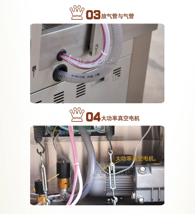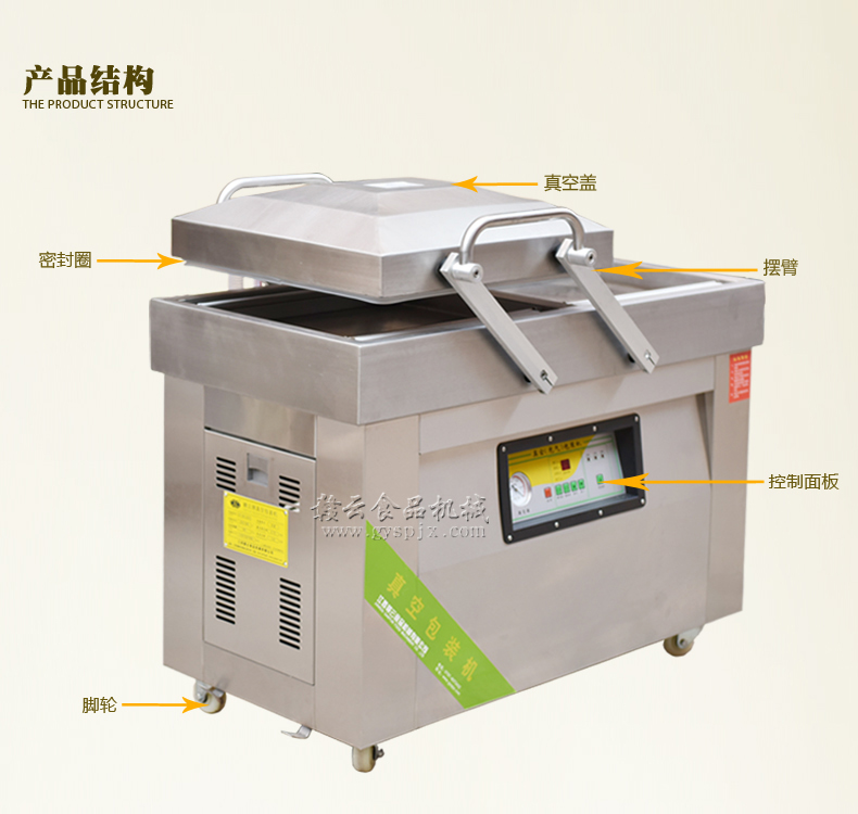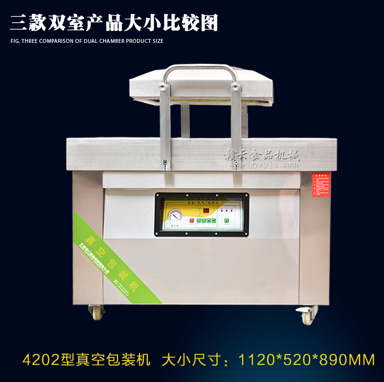 3、壓下真空蓋,面板上的抽氣指示燈亮,真空泵開始抽氣,機蓋即被自動吸引,抽真空時間可根據包裝要求調節適當時間。
