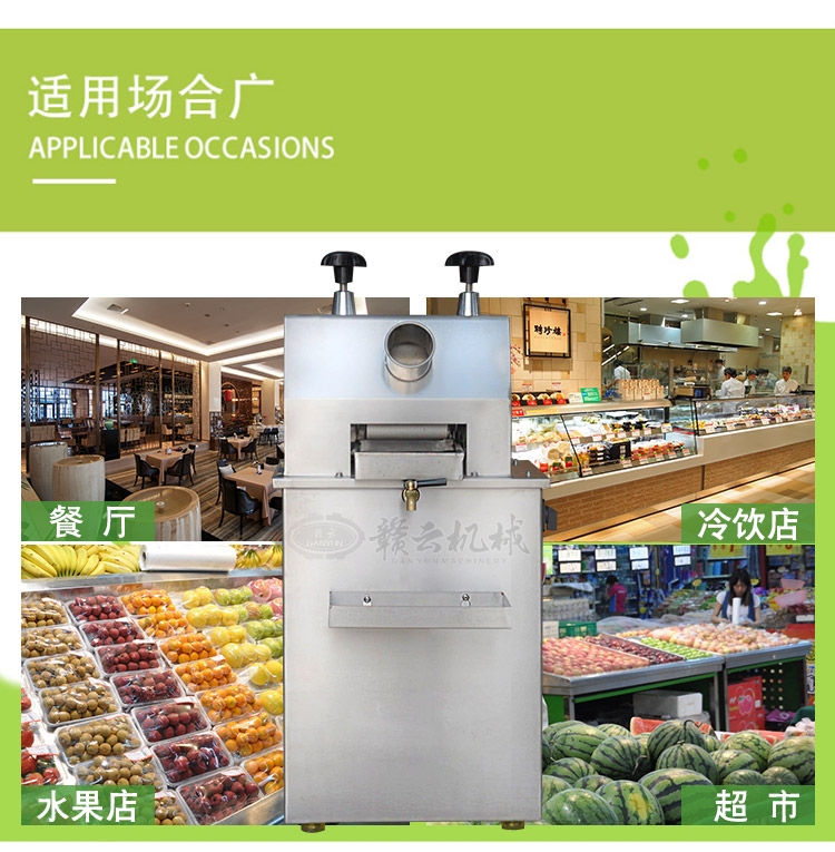 本產(chǎn)品適用于城鄉(xiāng)商場、菜場、商業(yè)街等人流量集中區(qū)。男女老少均可操作,成本低、利潤高,現(xiàn)榨現(xiàn)賣,是發(fā)家致富的好幫手。可加工甘蔗、生姜、蘋果、高粱桿、玉米桿等進(jìn)行榨汁之用。