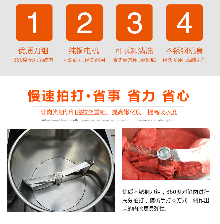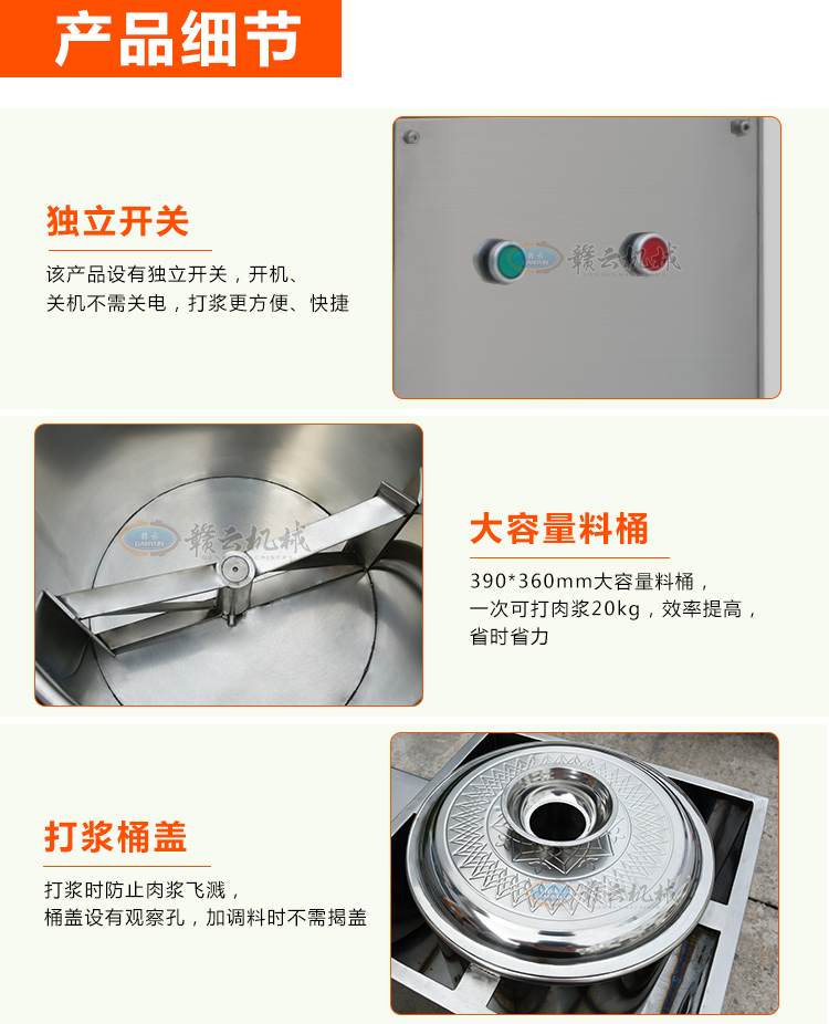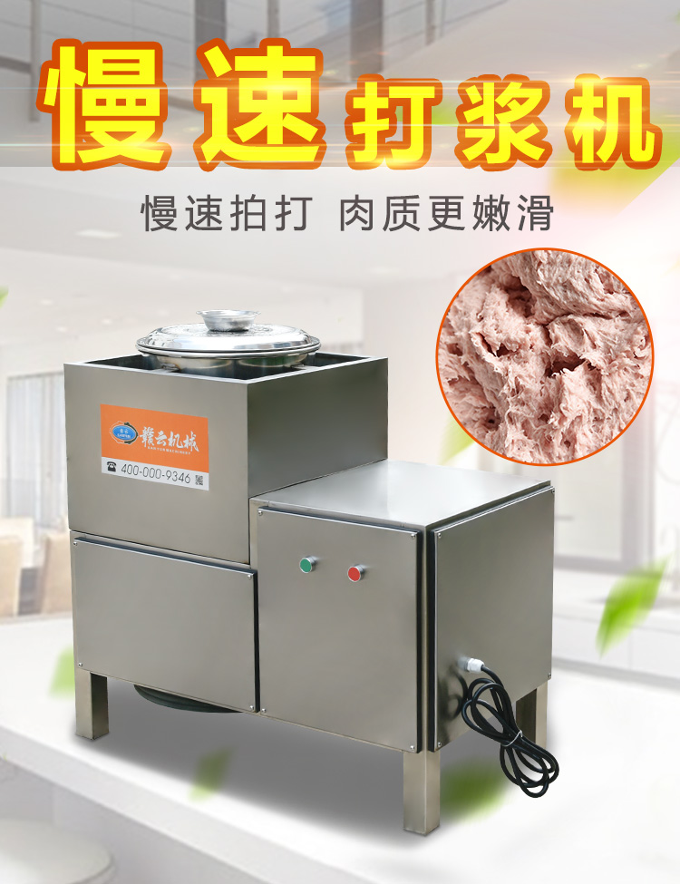 贛云牌36型全封閉式慢速肉丸打漿機(jī)選優(yōu)質(zhì)不銹鋼,在全不銹鋼慢速肉丸打漿機(jī)基礎(chǔ)上將整機(jī)外殼用不銹鋼板材封裝,更好的保護(hù)電動(dòng)機(jī),通過(guò)小皮帶輪帶動(dòng)大皮帶輪減速,慢速拍打肉漿。
