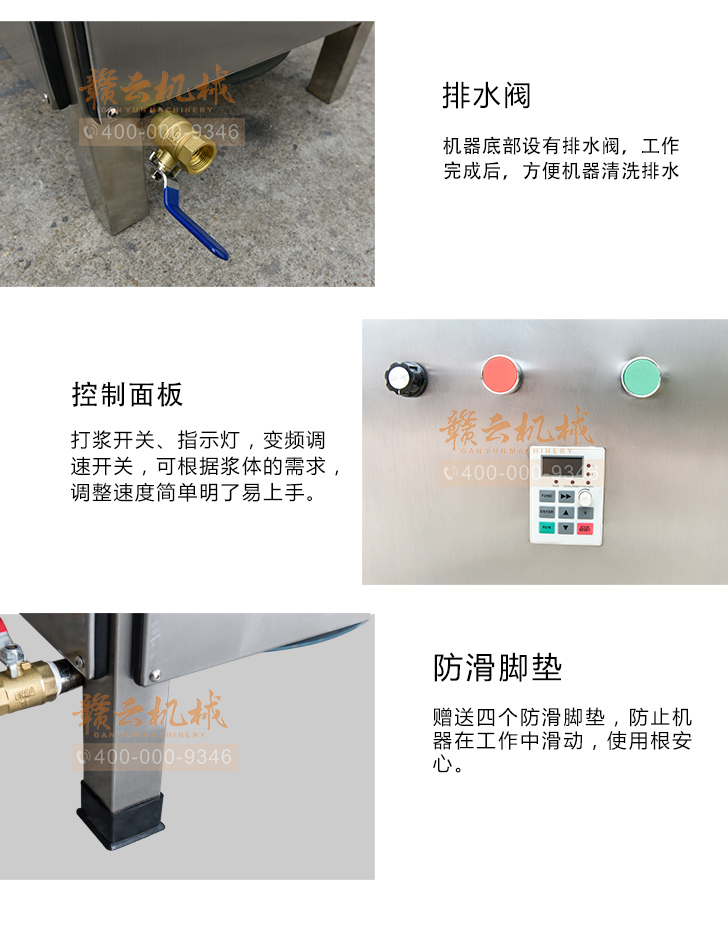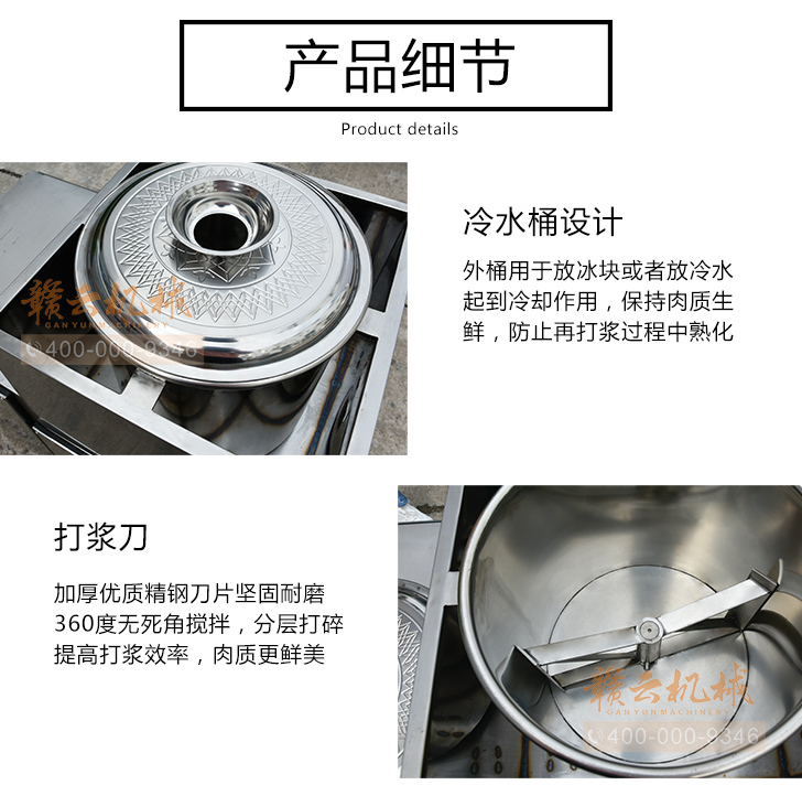 贛云牌36型全封閉式慢速變頻肉丸打漿機選優質不銹鋼,在全不銹鋼慢速肉丸打漿機基礎上將整機外殼用不銹鋼板材封裝,更好的保護電動機,通過小皮帶輪帶動大皮帶輪減速,慢速拍打肉漿。