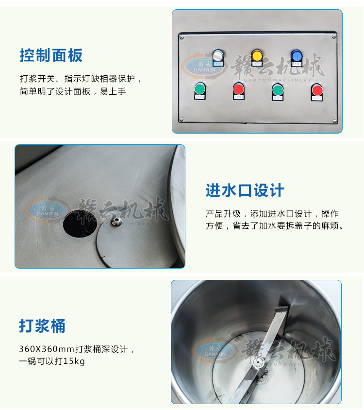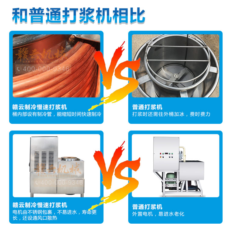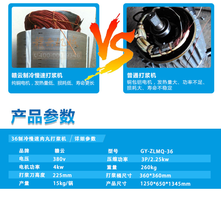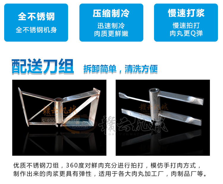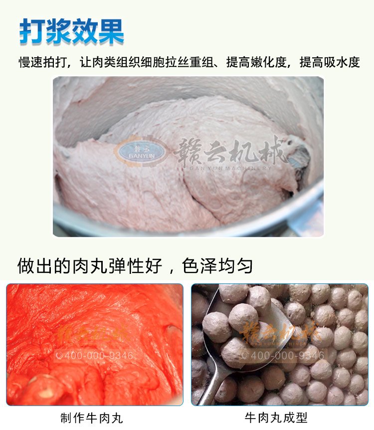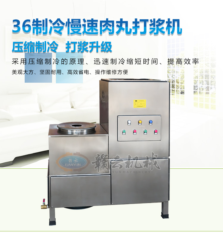 贛云牌36型壓縮機制冷式慢速肉丸打漿機,采用先進的壓縮制冷系統(tǒng),對打漿外桶進行制冷,有效確保肉類制品在打漿過程肉類品質(zhì),防止升溫改變?nèi)赓|(zhì),整機采用皮帶輪減速,通過慢速刀旋轉(zhuǎn)拍打肉粒魚糜等并調(diào)配成有一定粘稠度的漿狀物料,便于成型機成型,其拍打過程中能對肉類組織細胞拉絲重組,加大吸收水分,提高肉類的嫩化程度,打出來的漿類制成肉丸魚丸等,彈、脆、有嚼勁,產(chǎn)品一經(jīng)推出,深受肉制品加工客戶青睞。