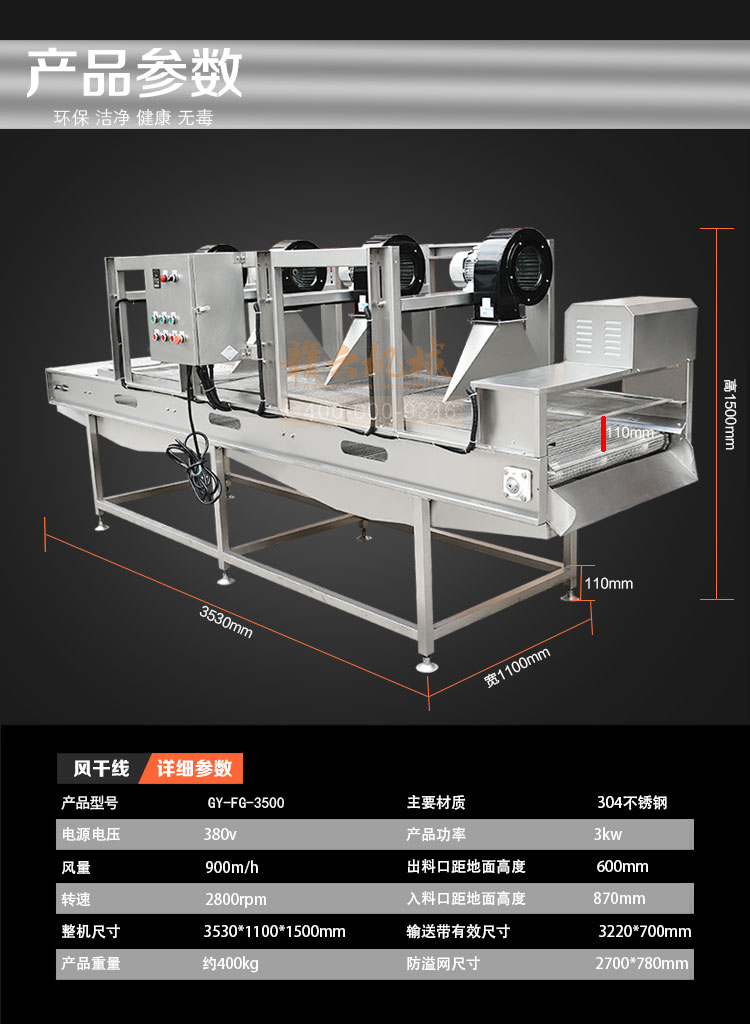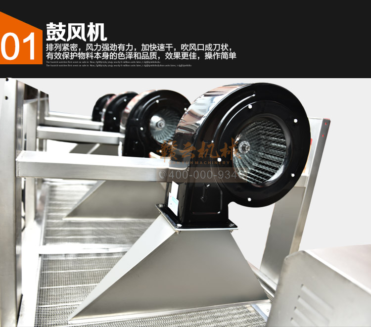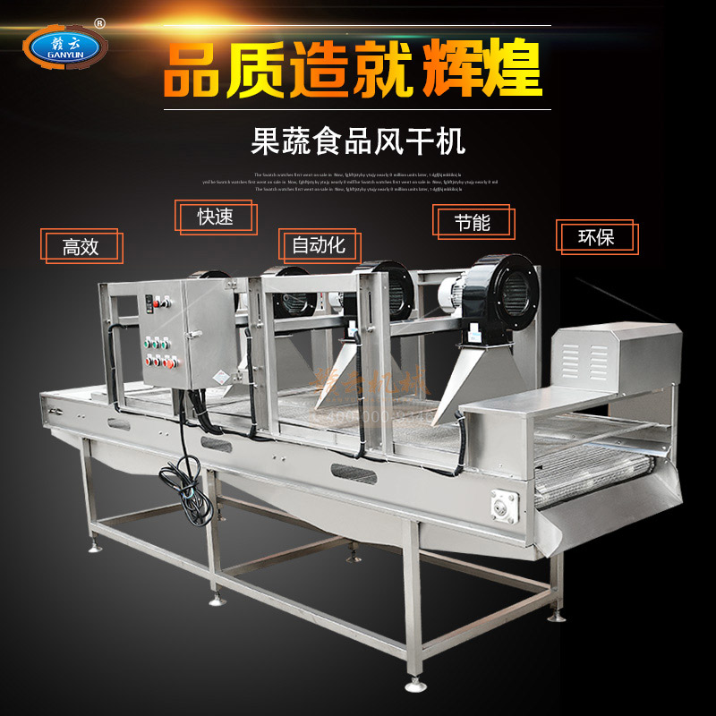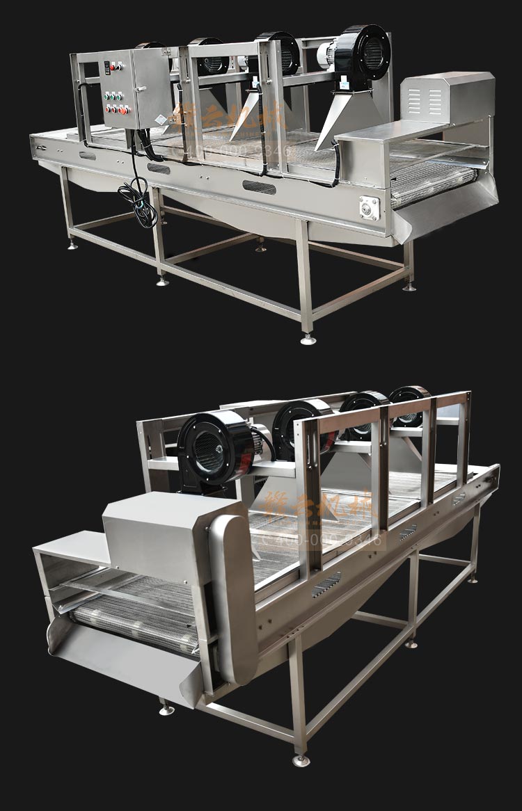 果蔬食品風(fēng)干機,高效、快速、環(huán)保、安全、自動化。強風(fēng)去除表面水分+震動輸送。果蔬食品風(fēng)干機主要用于清洗后的果蔬去除表面水,震動吹干改變了傳統(tǒng)離心脫水機帶來的蔬菜也損傷和傳統(tǒng)風(fēng)干機除水不徹底等問題,蔬果切割后清洗后進(jìn)入震動風(fēng)干機,在震動頻率下使物料向前傳送,在傳送過程中經(jīng)過多次強風(fēng)吹落物料表面的多余水分,使其蔬果表面無水鮮亮。最大程度上節(jié)約時間成本,勞動成本和運營成本,廣泛適用于蔬菜加工行業(yè)及廠礦、部隊、醫(yī)院、各大院校等單位食堂。