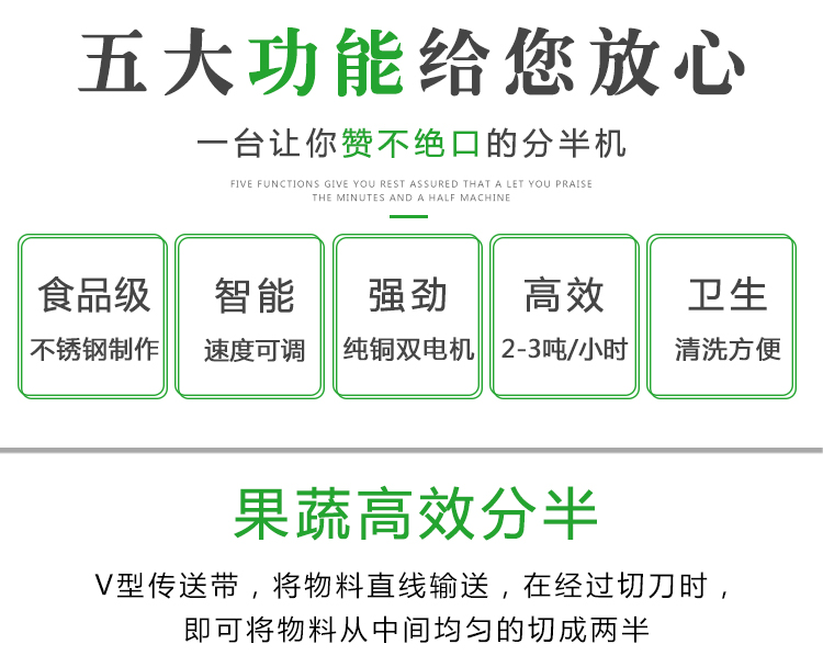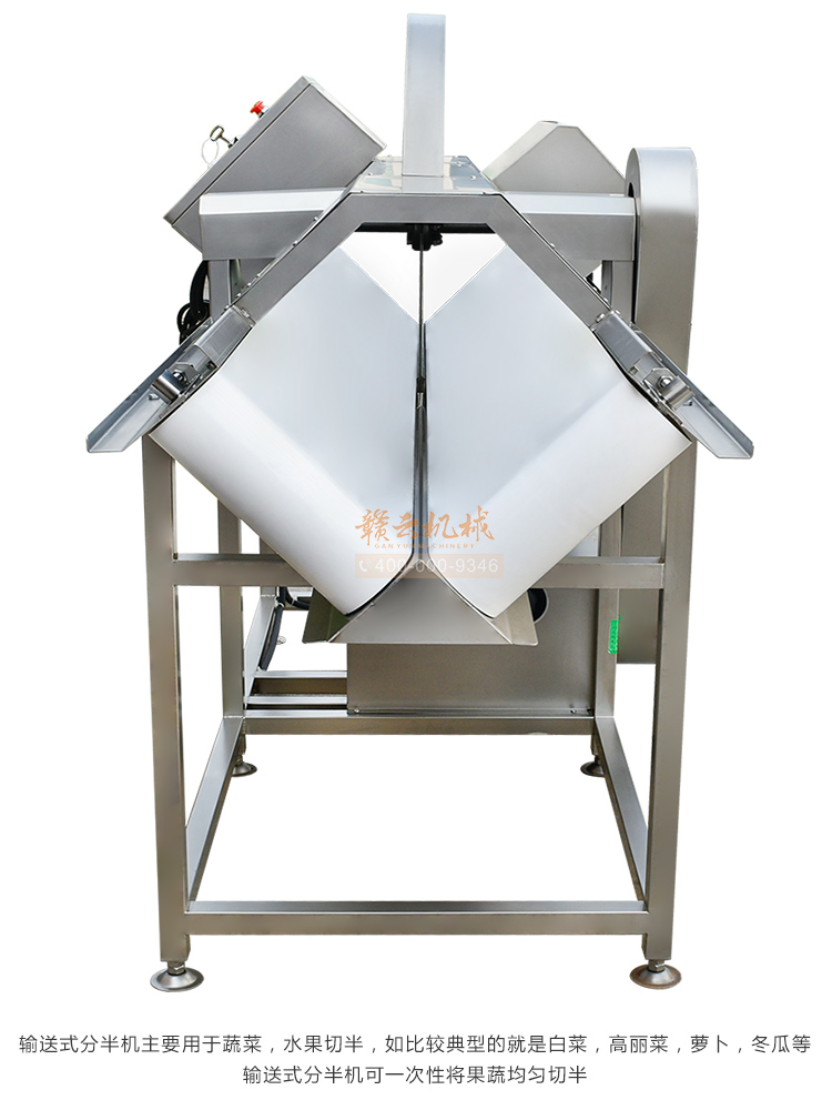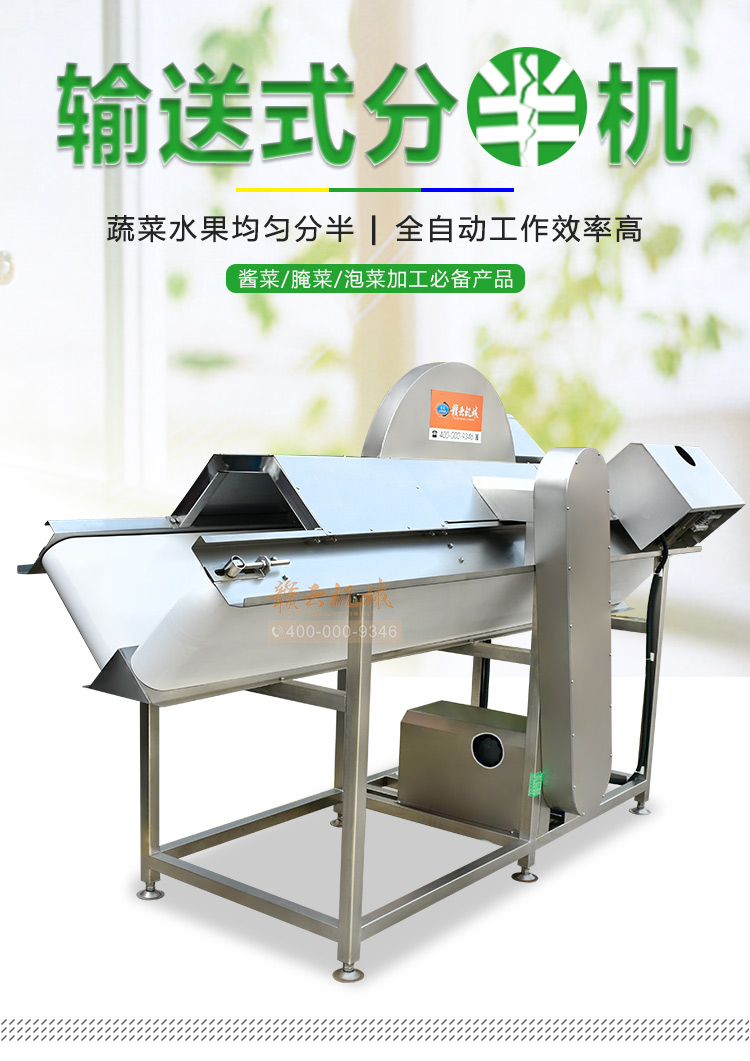 切半機(jī)主要用于果蔬類蔬菜加工。可將圓形,橢圓性,長條形,等物料,切割成兩半。該設(shè)備常用于以下一些場所,泡菜加工,果蔬類加工廠,政府機(jī)關(guān)單位,無刀化廚房等。該設(shè)備物料切割勻稱,分半大小一致,大顆的白菜蘿卜冬瓜都可一次性分割成兩半。是果蔬加工行業(yè)的好幫手