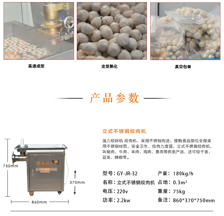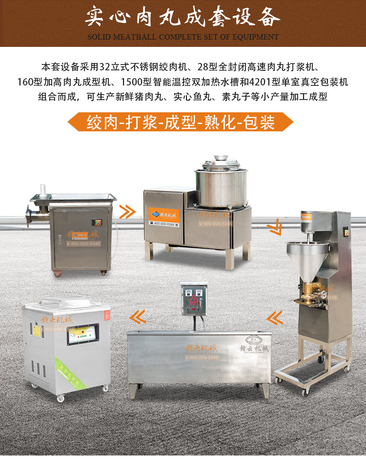 帶真空包裝新鮮豬肉丸,帶魚刺感魚丸生產(chǎn)成套設(shè)備,本套設(shè)備采用32立式不銹鋼絞肉機、28型全封閉高速肉丸打漿機、160型加高肉丸成型機、1500型智能溫控雙加熱水槽和4201型單室真空包裝機組合而成,可生產(chǎn)新鮮豬肉丸、實心魚丸、素丸子等小產(chǎn)量加工成型