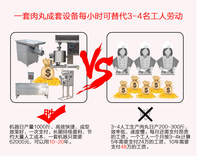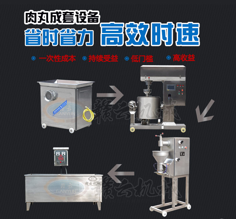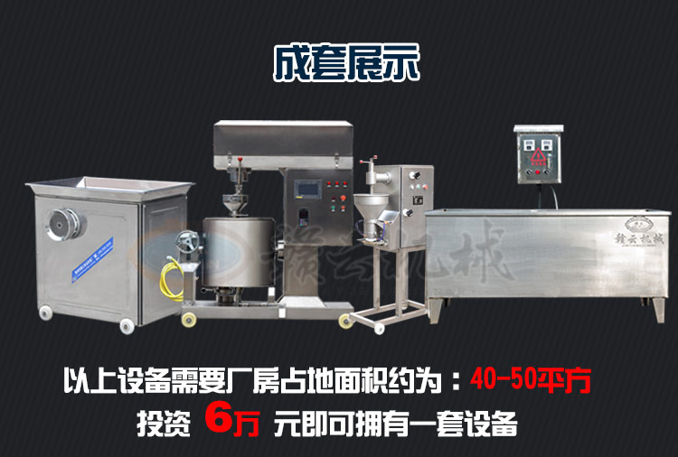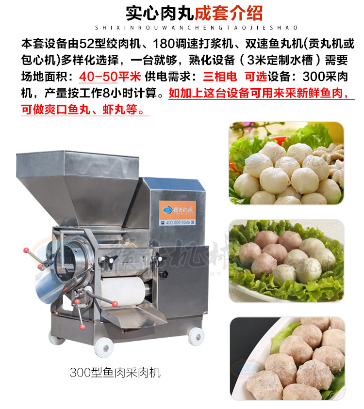 本套設備由52型絞肉機、180調(diào)速打漿機、雙速魚丸機(貢丸機或包心機)多樣化選擇,一臺就夠,熟化設備(3米定制水槽)需要產(chǎn)地面積:40-50平米供電需要:三相電可選設備:300采肉機,產(chǎn)量按工作8小時計算。如加上這臺設備可用來采新鮮魚肉,可做爽口魚丸,蝦丸等。