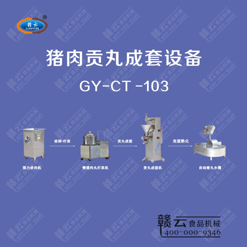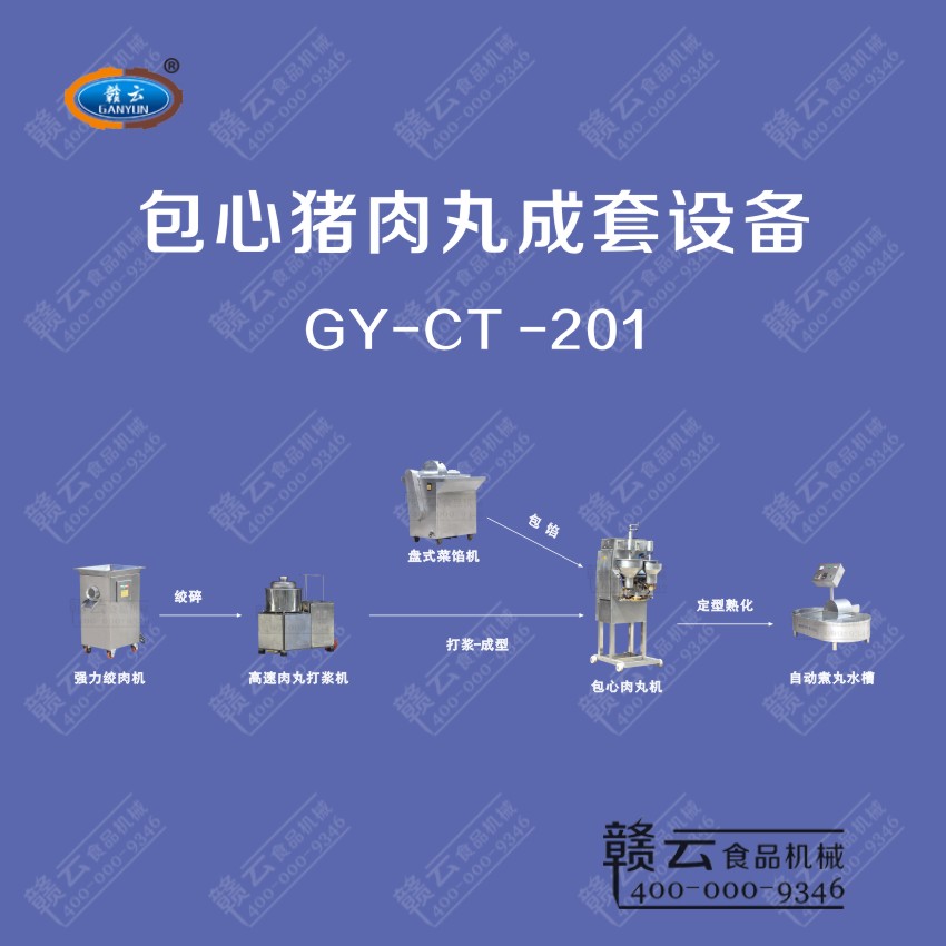 本套設備由:300型全不銹鋼魚肉采肉機、200型自動魚糜精濾機、36型全封閉慢速肉丸打漿機、300型盤式菜餡機、第二代肉丸包心機和自動煮丸水槽六臺設備組合而成。本套設備除了可以生產包心魚丸,還可生產實心魚丸,增加一臺強力絞肉機和高速打漿機亦可生產包心豬肉丸和撒尿牛丸。
