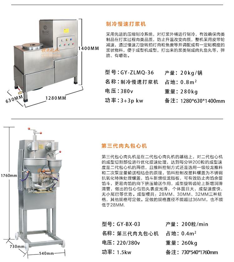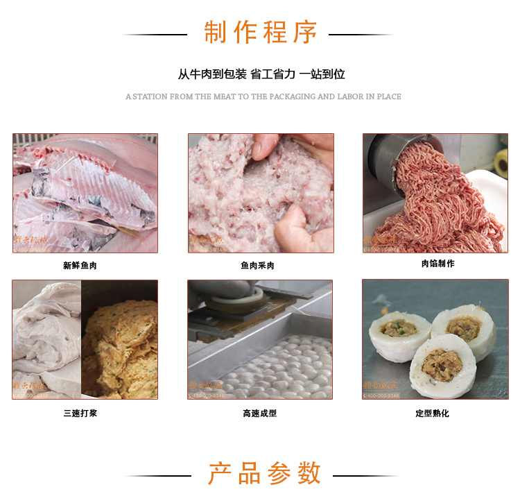 本套設(shè)備技術(shù)參數(shù)如下:立式不銹鋼絞肉機(jī)用于絞豬肉做肉末肉餡,200不銹鋼采肉機(jī)用于采取新鮮魚(yú)糜,然后通過(guò)制冷慢速打漿機(jī)攪拌成魚(yú)漿和肉餡,放入包心肉丸成型機(jī)中成型,后經(jīng)過(guò)雙加熱水槽定型熟化。