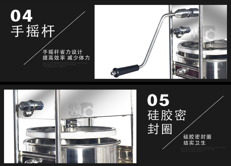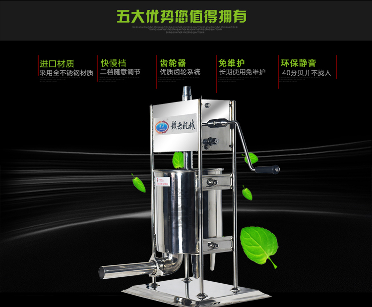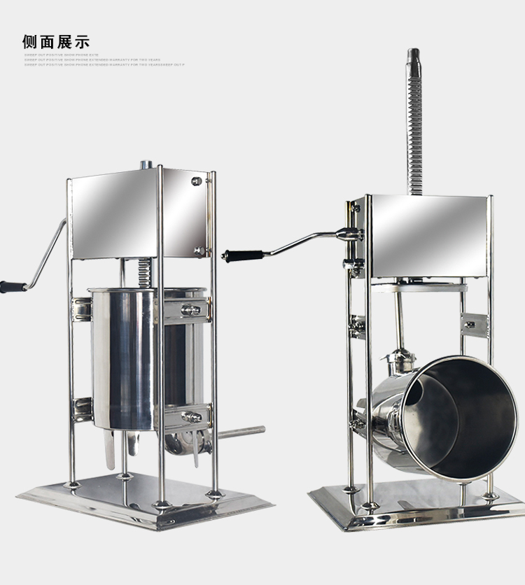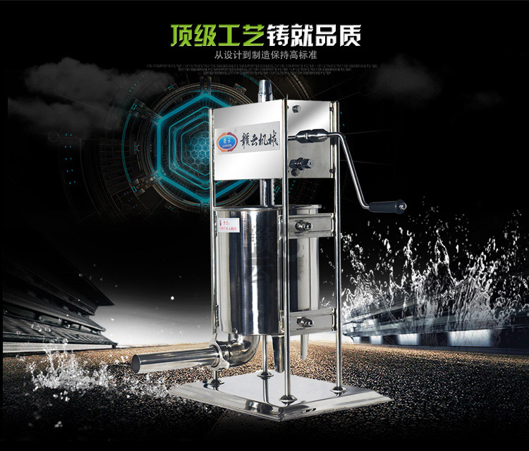贛云牌立式不銹鋼手搖灌腸機,專業灌制各種腸類,如臘腸、香腸、火腿腸、親親腸。整機采用全齒輪優質拉桿升降系統設計,液壓式灌腸,并兩檔速度可調,并有效利用了機械杠桿省力原理,讓你灌腸輕松自在,灌腸完畢之后還可放心全身水洗,裝料桶亦可方便拆卸,便于清洗。