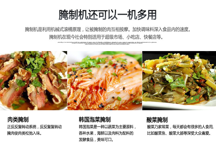 滾揉機可以使肉均勻的吸收腌漬,可以提高肉的結著力及產品的彈性;可以提高產品的口感及斷面效果;可以增強保水性,增加出品率;可以改善產品的內部結構,節能高效。整機采用不銹鋼制造,結構緊湊,滾筒兩端均采用旋壓式封帽結構,最大的增加滾筒內的摔打空間,使滾揉產品的效果均勻,噪音小,性能可靠,操作簡便,使用效率更高。