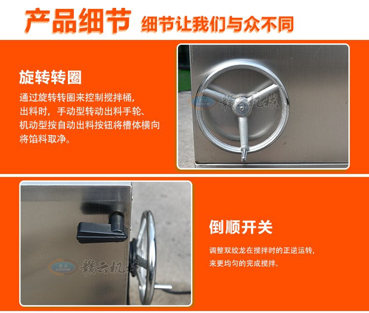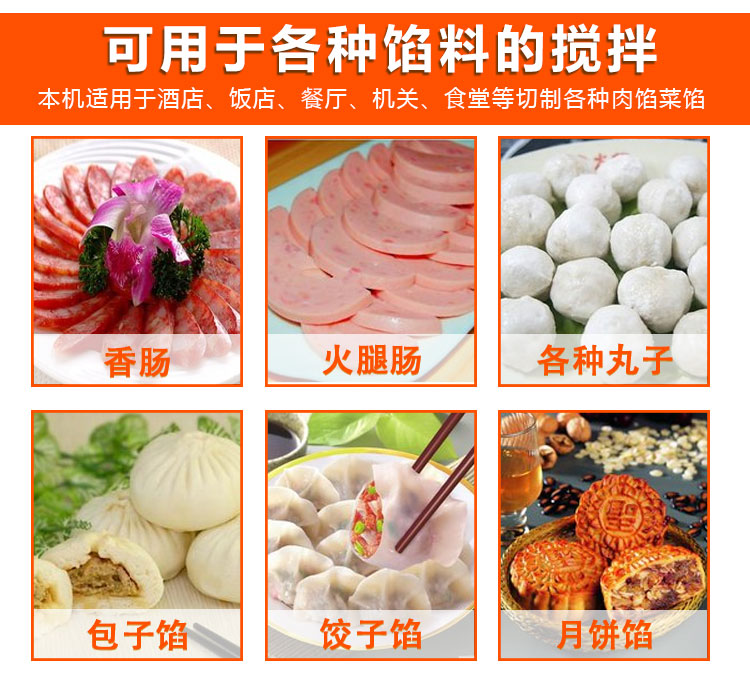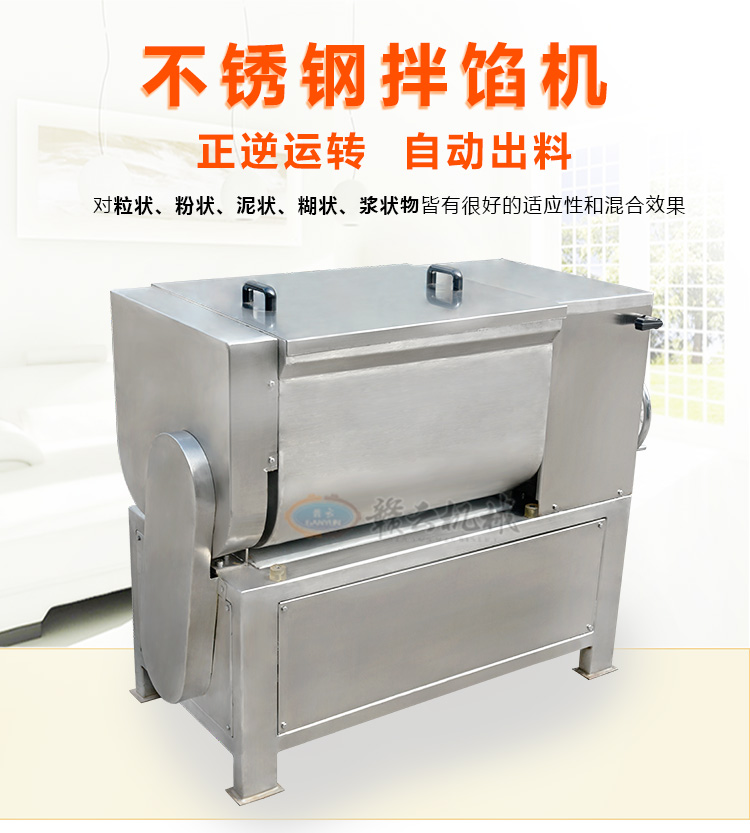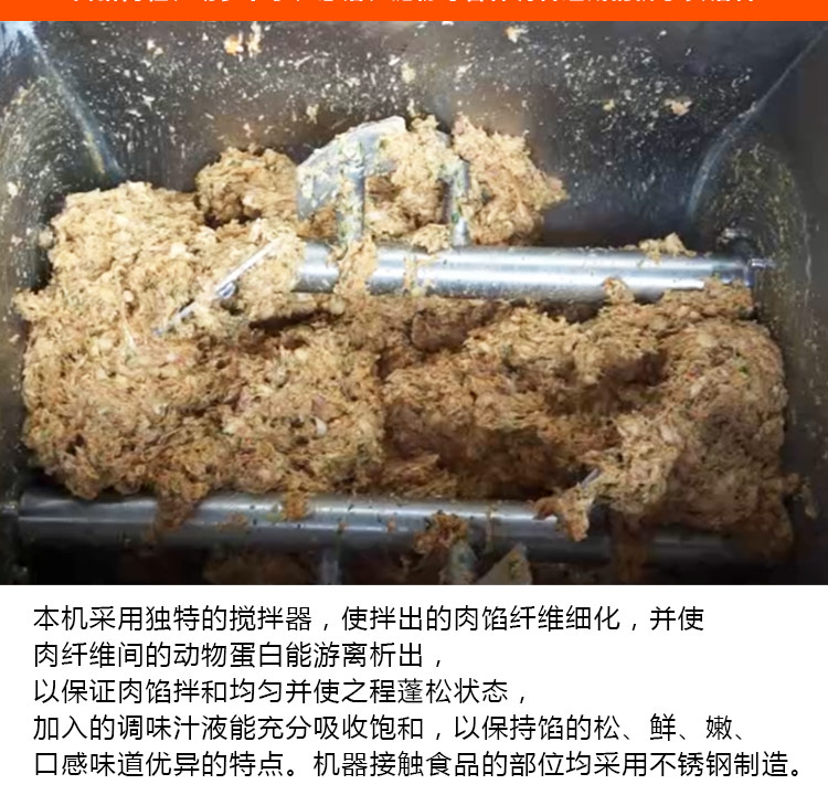 本機采用304不銹鋼材質設計,符合食品衛生加工需求,絞龍型攪拌鋼軸可向內向外雙向攪拌旋轉運動,由倒順開關控制攪拌方向,適合粘稠度較大物料的攪拌,攪拌過程還對肉質起嫩化效果,是肉餡、肉醬、菜餡等攪拌的上好設備。