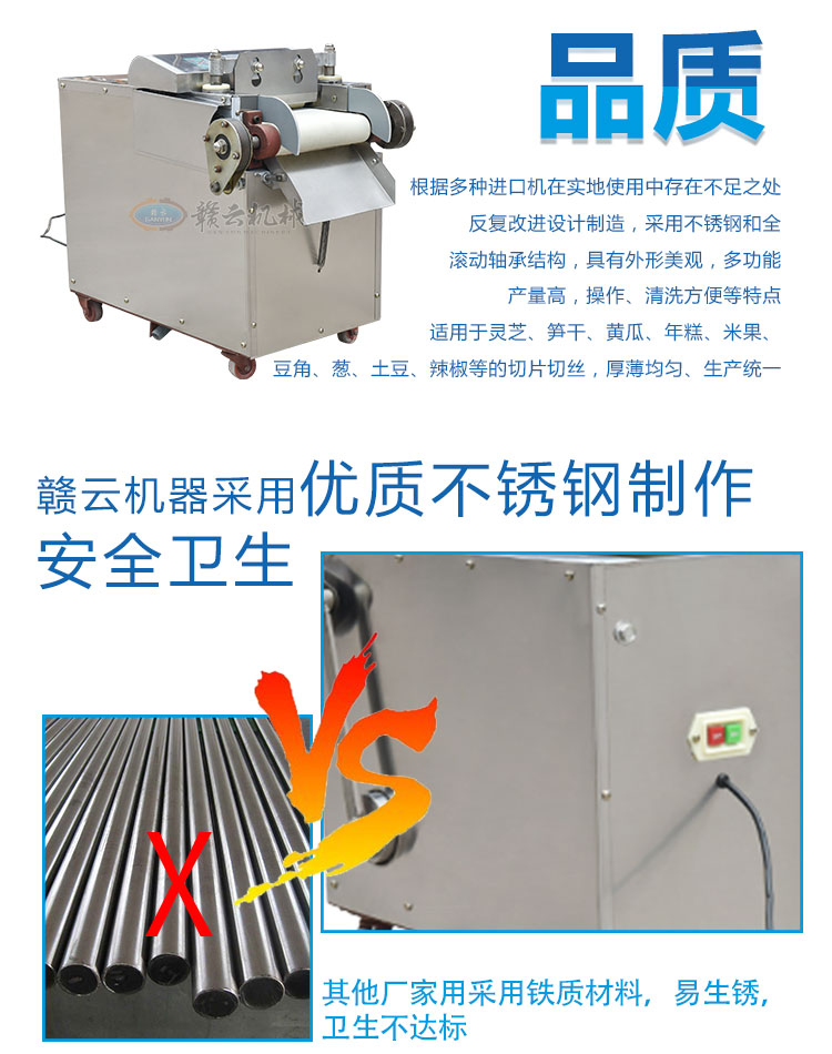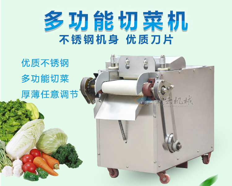 贛云牌多功能切菜機是根據多種樣機在實地使用中存在不足之處,反復改進設計制造,采用不銹鋼和全滾動軸承結構,具有外形美觀,成熟可靠,使用維修方便等特點。適用直蔬菜脫水、速凍、保鮮、腌漬等食品行業各類蔬菜。刀片距離可調節在0.1cm-2cm之間即切片、丁、絲厚薄在0.1cm-2cm。