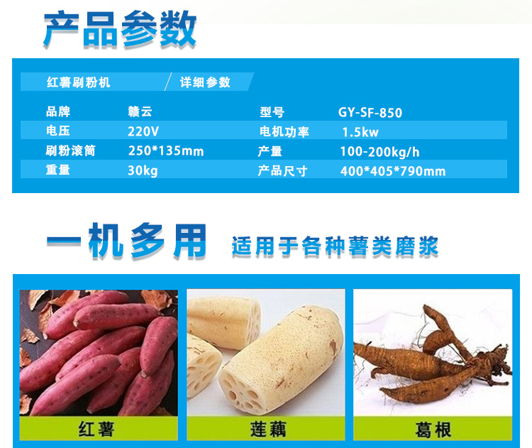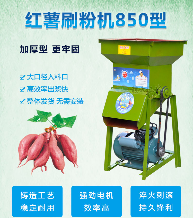 紅薯刷粉機適用于加工番薯/紅薯、木薯、馬鈴薯、蕉藕、芋頭及其它塊根作物的磨碎作業,加工成粉。適用于山區、半山區的糧食加工廠及普通用戶。可配用220V的1.5KW電機使用,也可配用柴油機,目前價格配的是國標銅線電機!