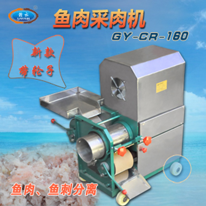 贛云牌新品普通款魚肉采肉機160型帶輪子,便于移動,魚肉魚刺分離原理:切好的魚小塊(整蝦、小蟹、小魚等)通過采肉帶輸送至采肉滾筒與采肉帶間隙,兩則相對滾動產生大力擠壓將魚肉擠入采肉滾筒內,魚刺和魚皮、魚鱗等因采肉滾筒壁小孔直徑只有3.5mm而無法進入,被滾筒外刮刀刮落,完成魚肉與魚骨、魚皮、魚鱗的分離。