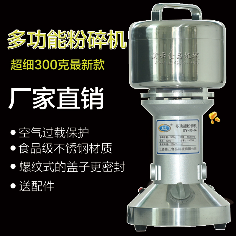 贛云系列多功能粉碎機采用純銅高速電機帶動粉碎刀片將物料快速打成粉末,可用于粉碎五谷、雜糧、田七、阿膠、白叁等,一般粉碎時間1-2分鐘即可,新款粉碎機改保險絲為空氣過載保護器,使用更安全,我廠提供的粉碎機有100克-2500克不同型號的多功能粉碎機。