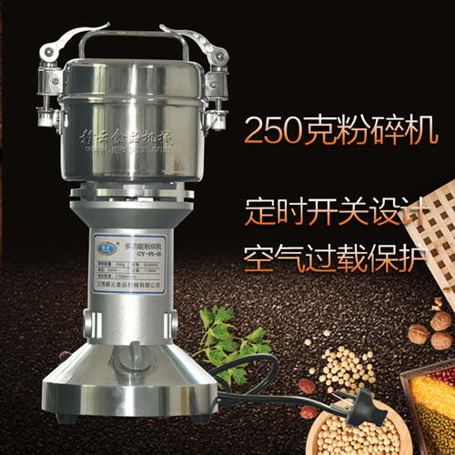 贛云系列多功能粉碎機采用純銅高速電機帶動粉碎刀片將物料快速打成粉末,可用于粉碎五谷、雜糧、田七、阿膠、白叁等,一般粉碎時間1-2分鐘即可,新款粉碎機改保險絲為空氣過載保護器,使用更安全,我廠提供的粉碎機有100克-1000克不同型號的多功能粉碎機。