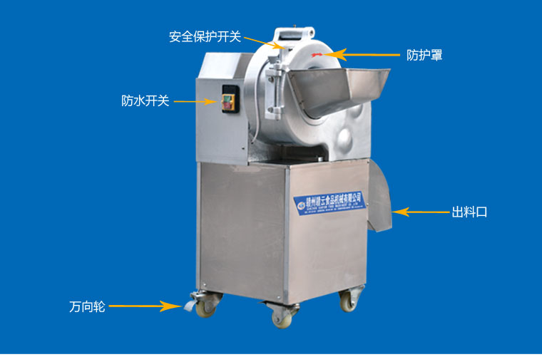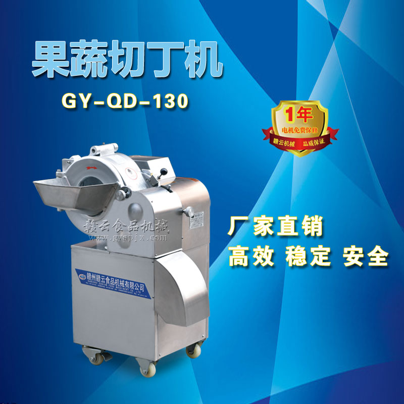 工作原理:GY-DQ-130型切丁機通過旋轉撥盤將被切物體帶動高速旋轉,利用物體的離心力,立刀將物體切成片狀,然后經過圓盤切絲刀片豎切成條狀,并將條狀物送入橫切斷刀口,由橫切斷刀盤切刀切成所需的長方體或立方體。