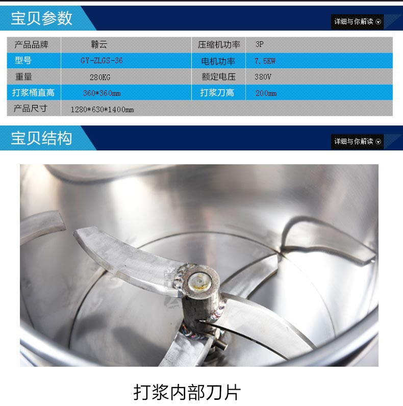 36型高速制冷打漿機技術參數:打漿桶直徑360mm ,外觀和大小與36型慢速制冷打漿機是一樣的,電機功率7.5kw  壓縮機功率3P。