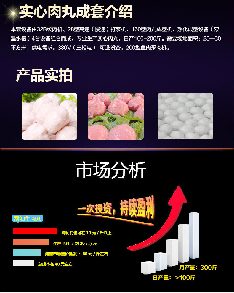 本套設備由32型絞肉機、28型高速(慢速)打漿機、加高成型機、熟化成型設備(雙溫水槽)4太設備組合而成,專業(yè)生產(chǎn)實心肉丸,日產(chǎn)100-200斤。需要場地面積:25-30平方米,供電需求:380V(三相電)可選設備:200采肉機