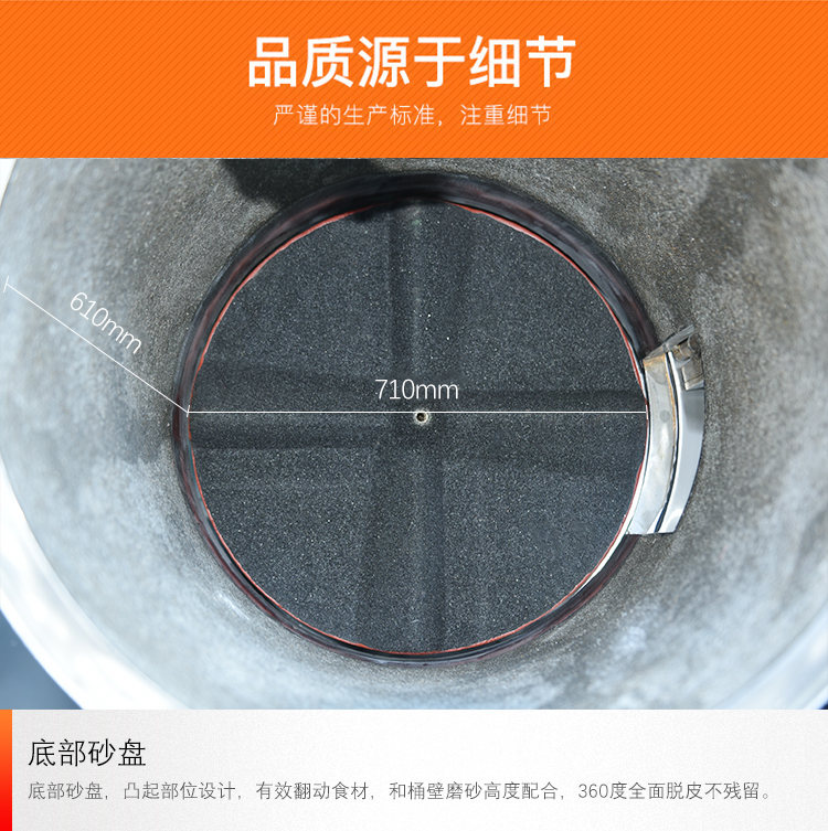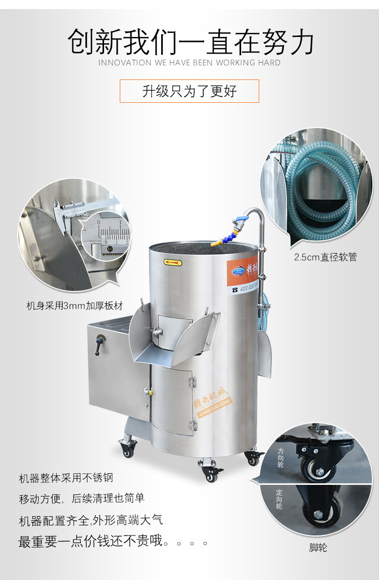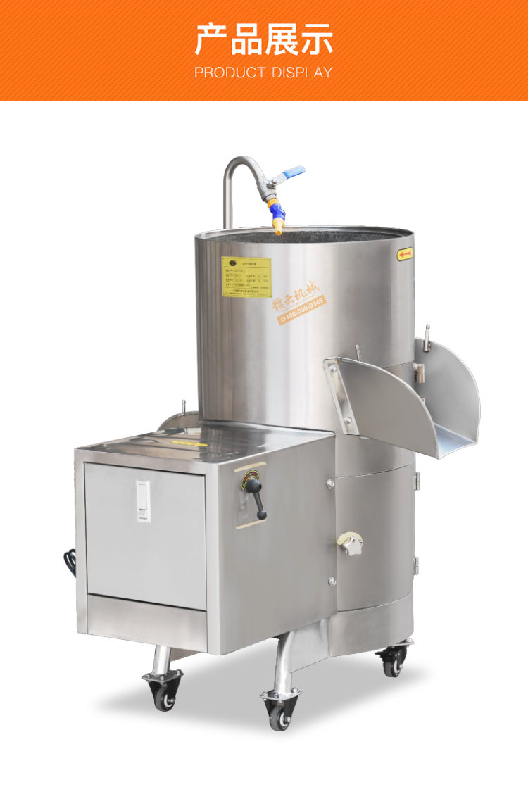 初次使用土豆脫皮機前,請先檢測機器的各個部件是否齊全和安裝穩固,并且電源是否正確接通,可參閱土豆脫皮機使用說明書,在檢測無誤后,先將土豆放入脫皮機的料桶后,將電源開關打開,電源開啟后,料桶地盤通過高速旋轉將不斷翻動土豆并且讓土豆與周邊磨砂摩擦達到去皮效果,高速帶動土豆在料桶壁上不停的碰撞摩擦,使土豆去皮效率高。土豆脫皮機料桶底盤采用沙盤構成,凸起部位設計,有效翻動食材,和桶壁磨砂高度配合,360度全面脫皮不殘留。在通過可調節膠頭滴管,根據操作需要隨心調節水流,想沖哪里沖哪里,省時省水去皮之后更干凈配上開關閥門,停放水更方便,可以保證出工后的土豆干凈、清潔。