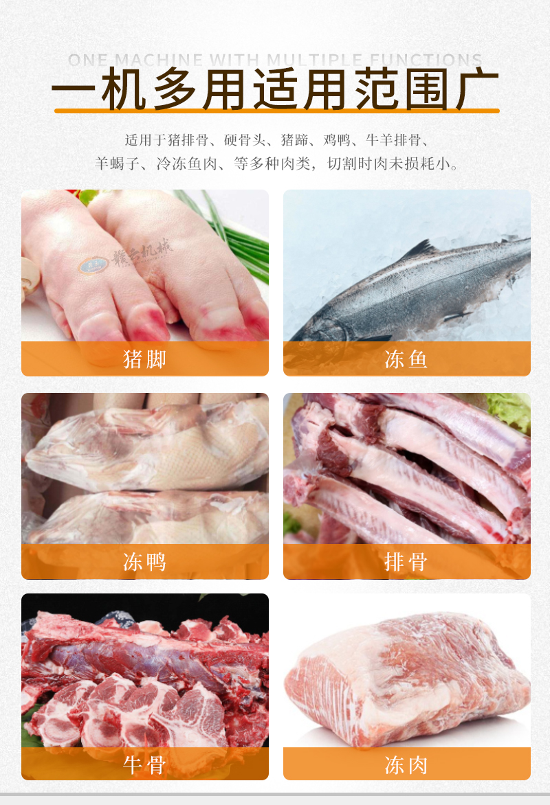 適用于凍肉、硬骨、凍魚、豬腳、豬頭、牛頭等快速精準切割。