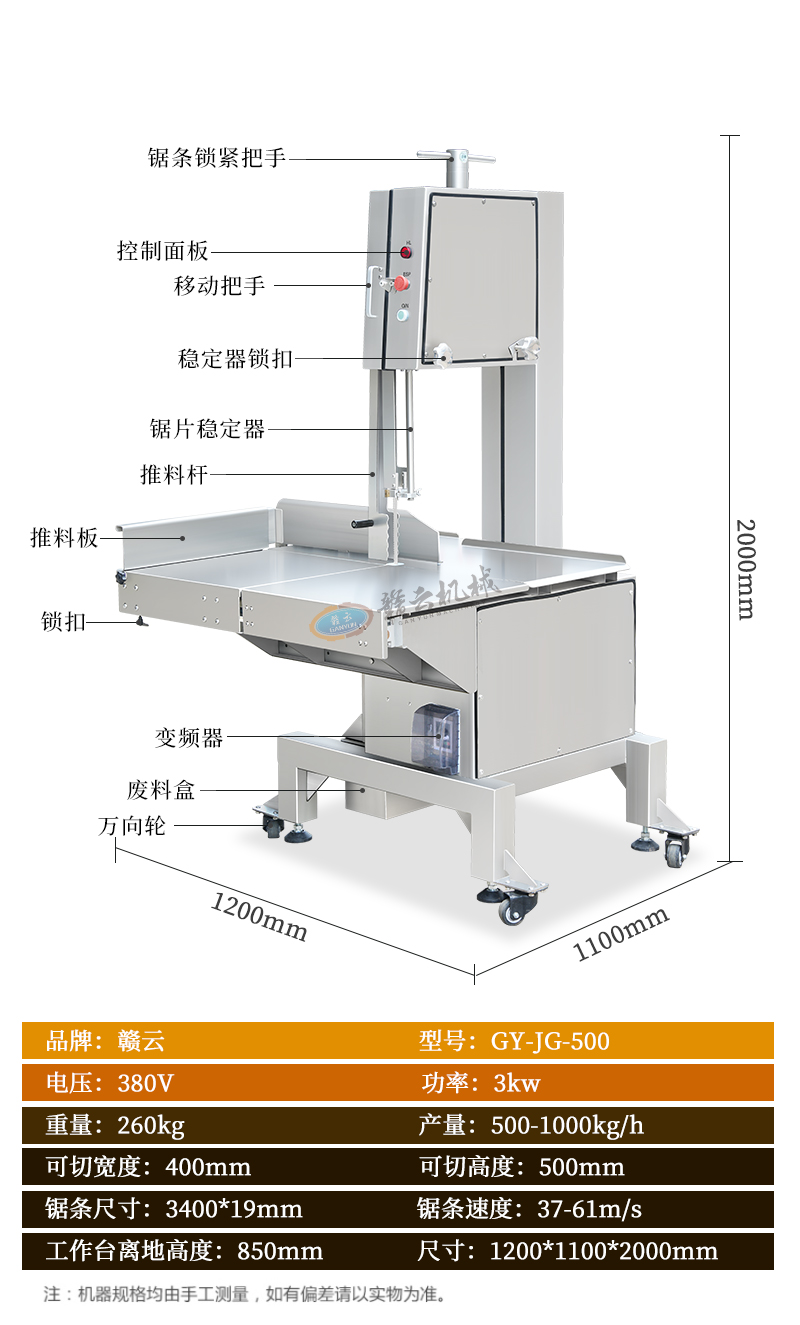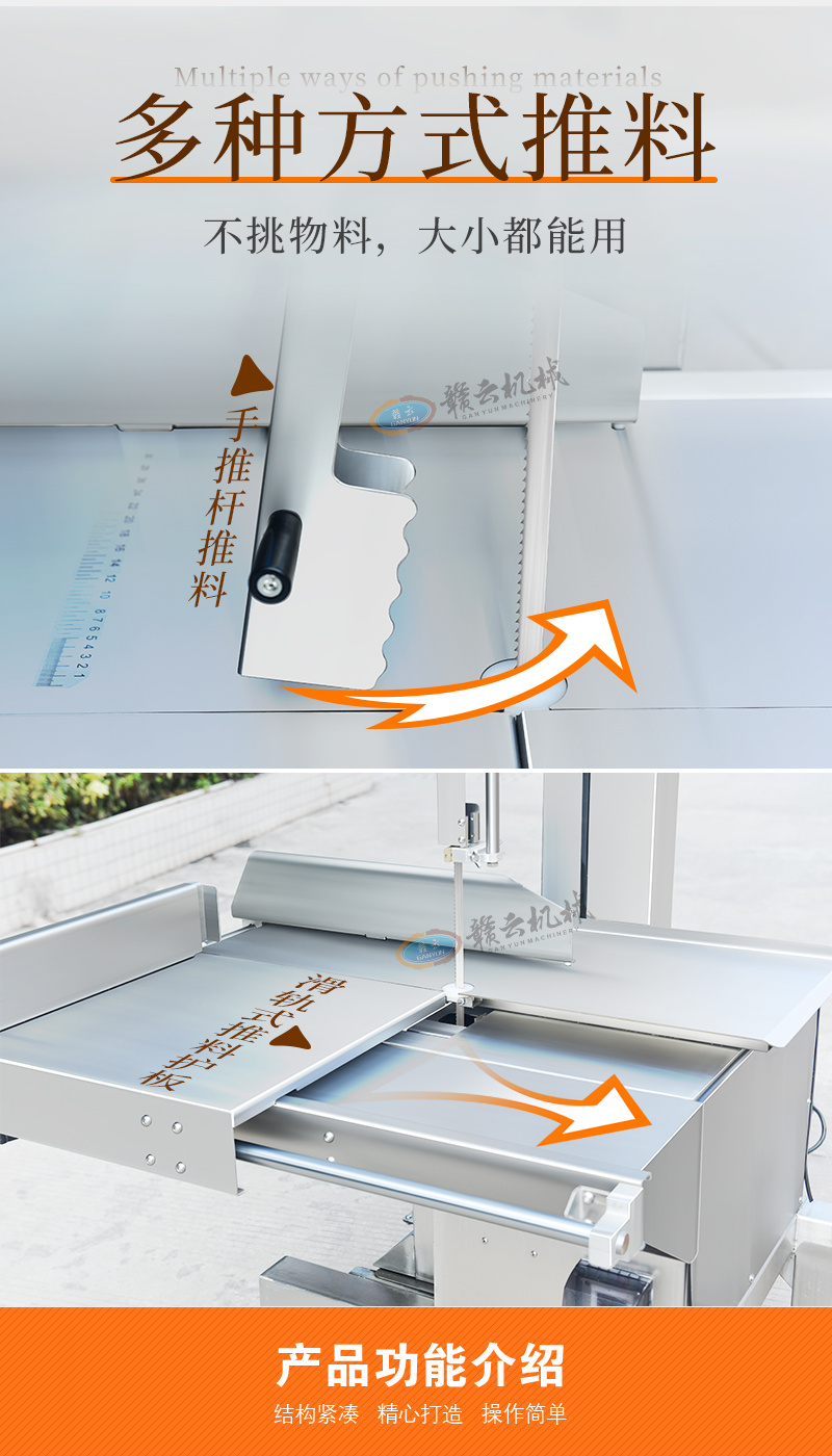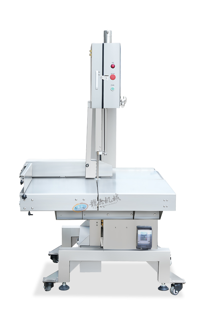 贛云機械旗下全自動大型商用鋸骨機設備,采用304不銹鋼材質,具備大容量工作臺、操作簡便、高效率的切割、采用可滑動的臺面助推和其它多種推料設計,讓機器更安全。鋸骨機適用于大型食品廠、水產加工企業、肉類加工企業、大型屠宰廠、中央廚房等場所。能對凍肉、硬骨頭、冷凍魚、豬腳、排骨、羊蝎子、豬頭、牛頭等快速精準切割。我廠的鋸骨機設計人性化,以安全、衛生、易于清潔和保養等優勢受到客戶的信賴。