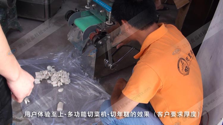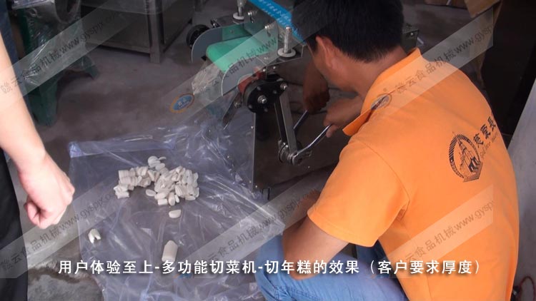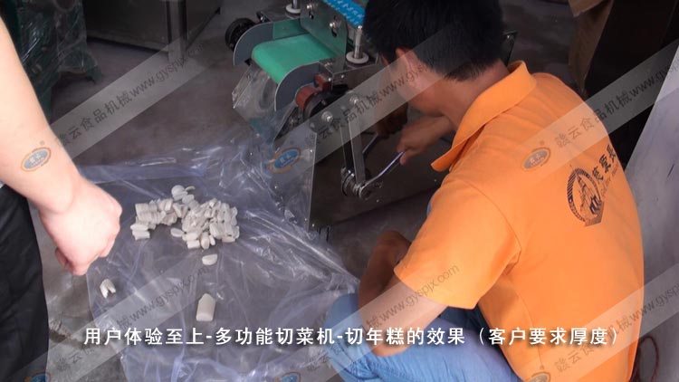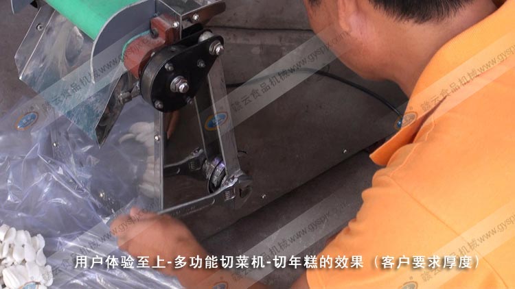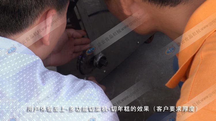 2012年6月27日上午,贛云接待了來(lái)自浙江溫州市王先生,體驗(yàn)多功能切菜機(jī)(GY-QC-660)切年糕片的效果,試機(jī)過(guò)程,贛云技術(shù)人員演示了切菜機(jī)的走刀量的調(diào)整,王先生也親自掌握了走刀量調(diào)整操作技術(shù)要點(diǎn),以下是試機(jī)過(guò)程實(shí)拍圖片: