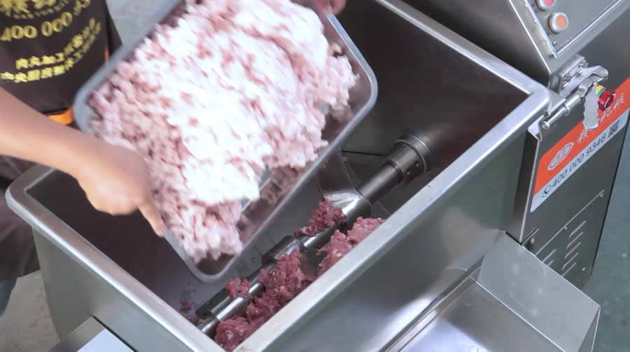 首先將所有原料準(zhǔn)備好,原料有:鮮豬肉(比例為:瘦6肥4)、胡蘿卜、生姜、小蒜、馬蹄、淀粉、冰水等。第一步是需要將原料通過絞肉機(jī)絞碎,這一步是使用贛云42型不銹鋼絞肉機(jī),這臺機(jī)器可以用于鮮肉、微凍肉類、蔬菜等絞碎,機(jī)器動力強(qiáng)勁,絞肉速度快,每小時可達(dá)600公斤。