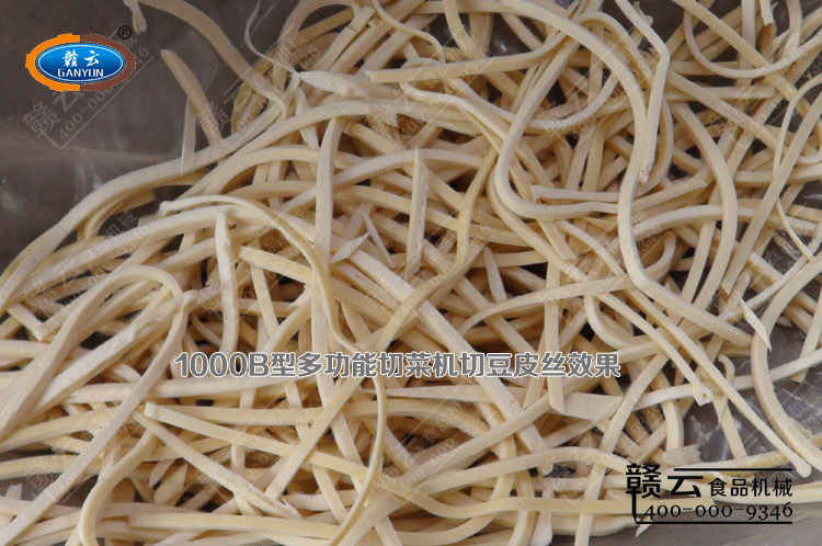 成品豆皮較長較寬,手工切豆皮絲不僅麻煩,而且所切規格尺寸不均勻,1000B型切菜機切豆皮絲不但切絲厚薄均勻,而且加工效率是手工切絲的幾十倍,原來需要十幾員工人分配切絲的,現在一臺機器就解決了豆皮廠加工需求,大大提高了生產廠家的加工效率,同時解放了更多的勞動力,降低了生產成本。