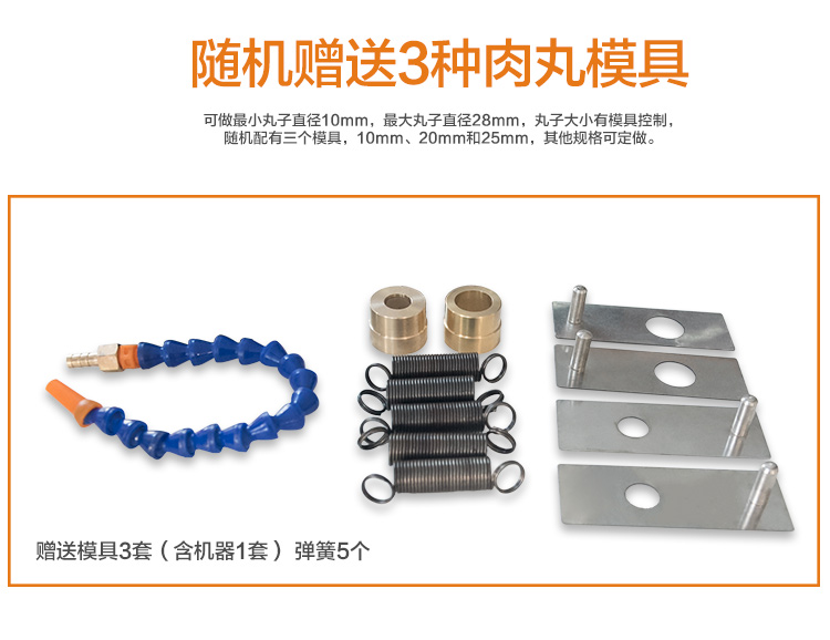 本款160型實心肉丸成型機是在120型實心肉丸成型機的基礎上加高設計,生產的肉丸具有密度小,圓度小,外表光滑等特點,深受客戶喜愛,適合餐廳、飯店、肉食加工廠使用,還會贈送您獨特的配方,肉丸成型機助您快速的占領市場。本款實心肉丸成型機是在120型實心肉丸成型機的基礎上加高設計,是配合我司設計的雙加熱水槽而設計,隨機配15、20、25MM三套成型模具,可做三種規格丸子,采用絞龍推料擠壓,切刀快速切割成型原理設計。隨肉丸成型機帶有詳細的操作說明。