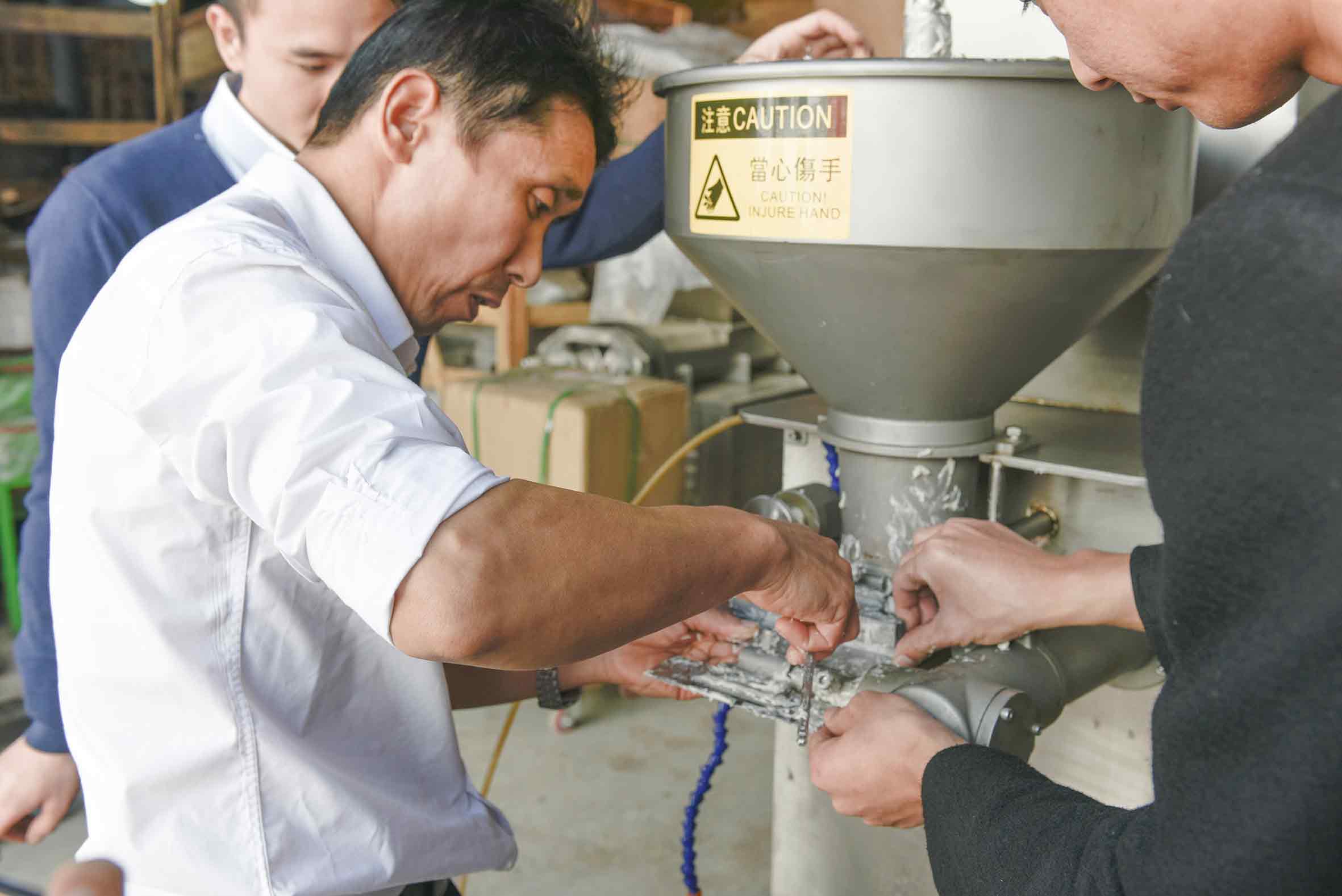客戶看到丸子調整的過程,便來了興致要向技術人員學習如何調機器,客戶現場調整肉丸成型刀片。